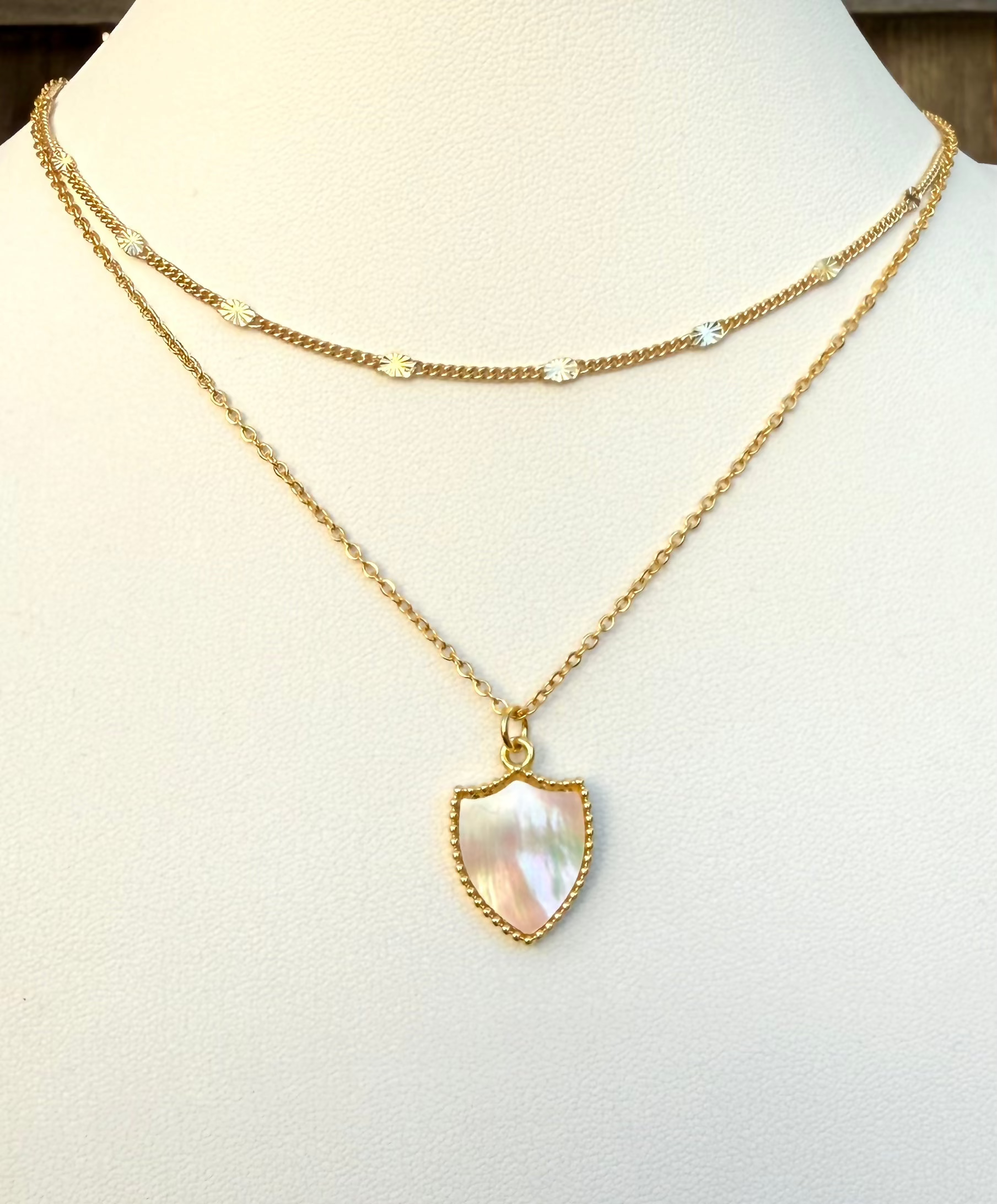 Experience the luxury of this 24K Gold-Filled rolo chain necklace, with Shell Pearl Shield Pendant. Feel the beauty of the dainty link necklace, offered at 16 or 18.5 inches, a dazzling shield of strength.